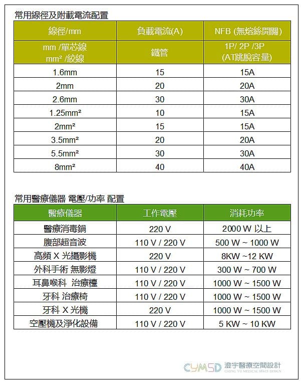 一般的院所 , 除了常用的 插座及開關用電外 , 對於一些用電量大的醫療設備, 如消毒鍋 , 無影燈 , X 光機 , 雷射儀器 , ENT 治療檯…….等 需另外在水電工程配電時給予獨立電源 , 並依器材耗電功率 , 決定線徑大小及無熔絲開關的額定電流。